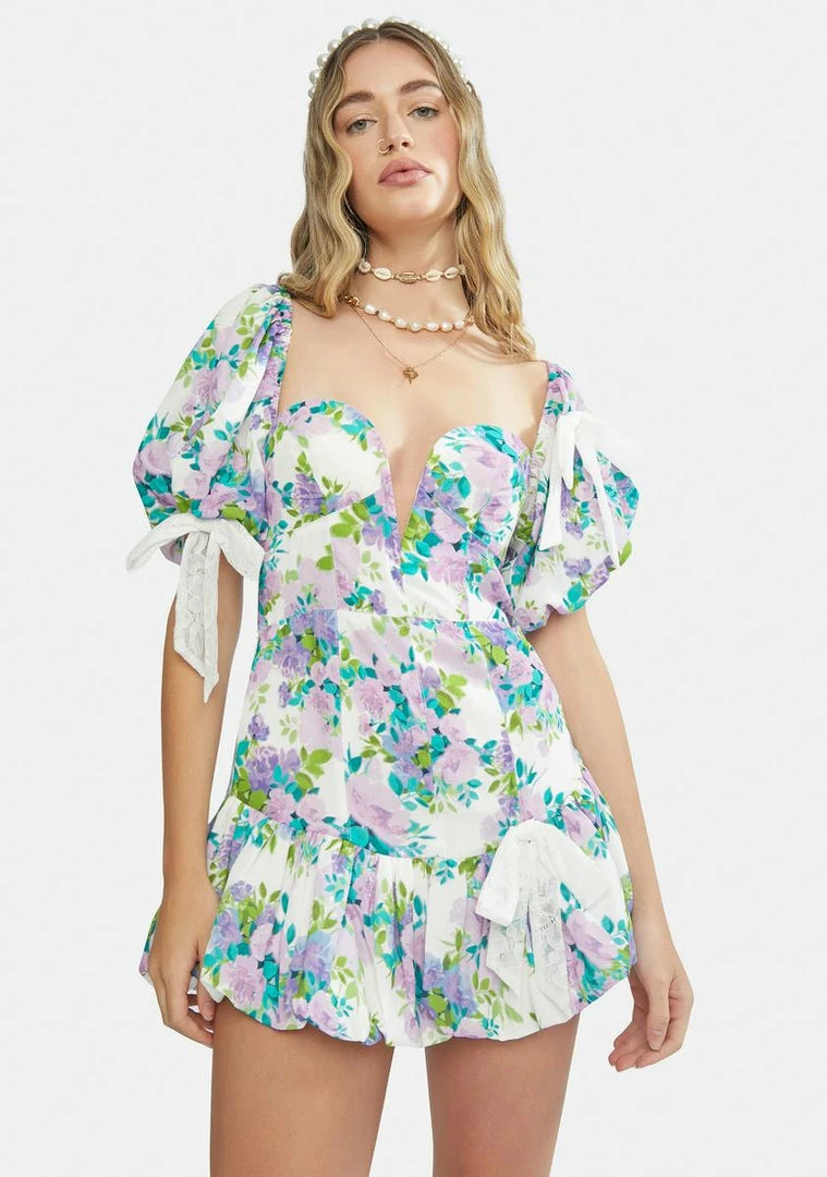 features short puff sleeves, a plunge sweetheart neckline, a floral pattern all over, ruffle trim at the hem, and bow details all over.