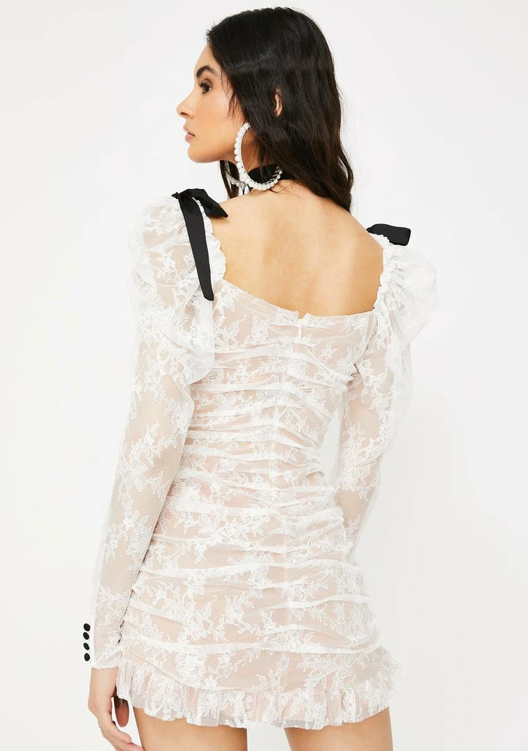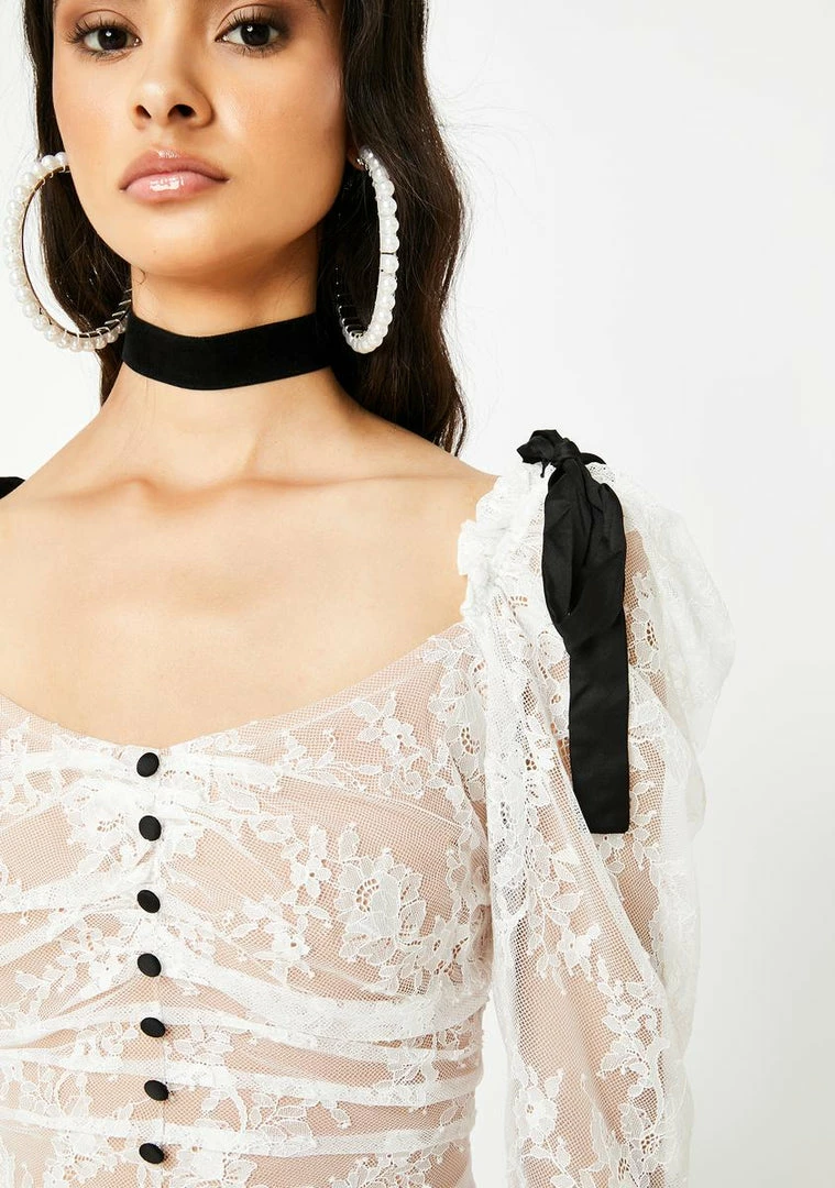 got ya lookinΓ’ΒΒ like a romantic sweetheart, boo! Fall in love in this pretty lil number that has a ruched lace construction, front button embellishments, NΓ’ΒΒ contrast bows on the shoulders.