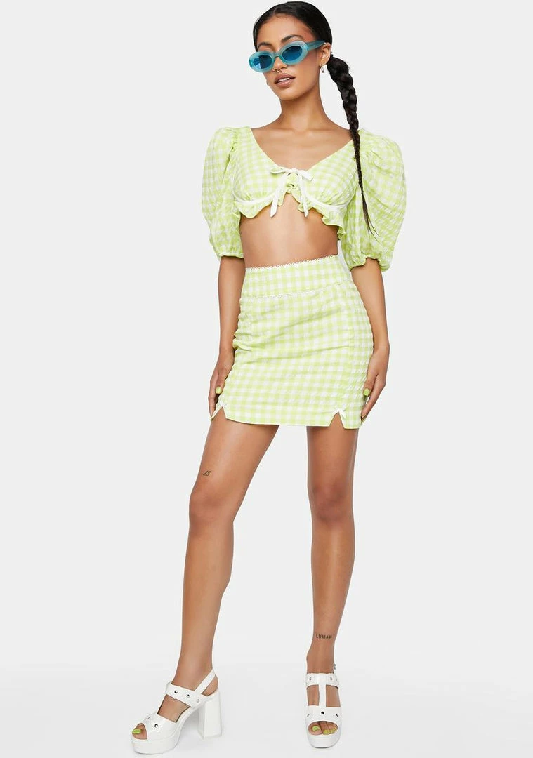 cuz you’re always put together. This mini skirt comes with a high waist, loop trim details, hem slits with bow details, a back zip closure, and a gingham print all over.