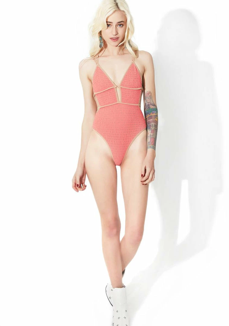 is gunna quench that lingering thirst, bb~ This ultra hott one piece swimsuit features a curve lovinΓ’ΒΒ ruched coral construction, plunge neckline, strappy nude trim throughout with minimal gold connectors, and a supa cheeky Brazilian cut.