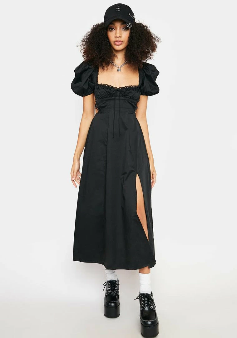 has a cotton construction, a sweetheart neckline with a ruffled trim, puff sleeves, cut out design at the sides,criss cross adjustable lace ups in the back, and a side slit.