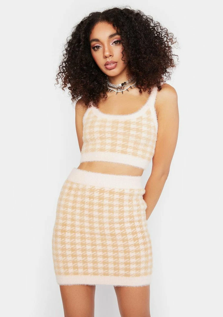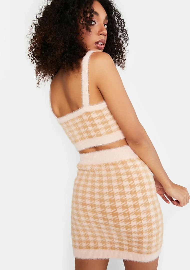 cuz you’re not clueless. This skirt has a fuzzy mohair construction, houndstooth design,high rise waistline, and a bodycon fit.