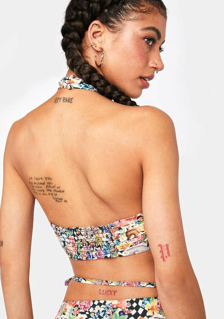cuz you dare to be different. This top has an all over trippy floral checkered print, an open back, criss cross halter neckline, ruched detailing, and a back button closure.