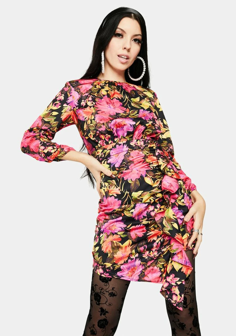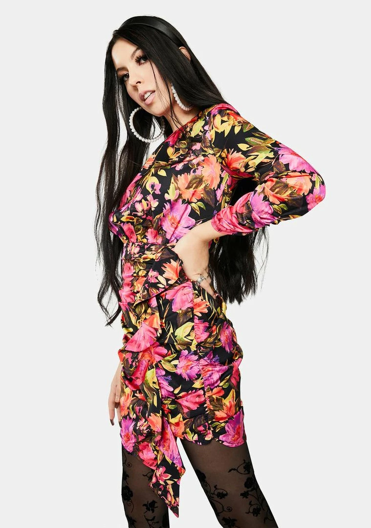 for when youΓ’ΒΒre feeling boho chic. This floral print ruched mini dress has an asymmetrical hemline with a cascading ruffle, a peekaboo button back, ΓΒΎ sleeves with shoulder pads, and a hidden back zip closure.