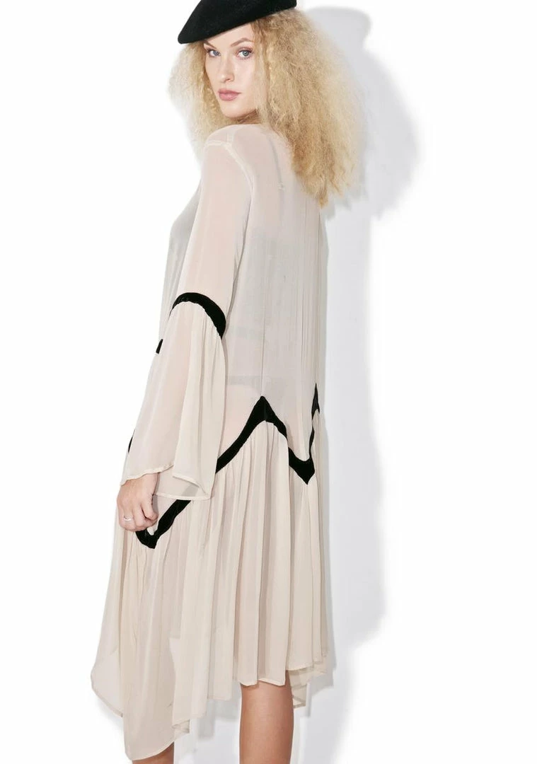 when ya walked by, we knew you were too good to be trueรขยยฆ This gorgeous layering piece features a delicate sheer pinky-nude construction, flowy oversized fit with asymmetrical hemline, bell sleeves, and plush black velvet trim.