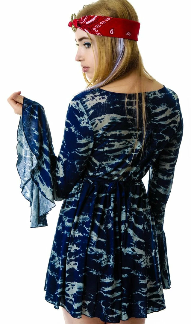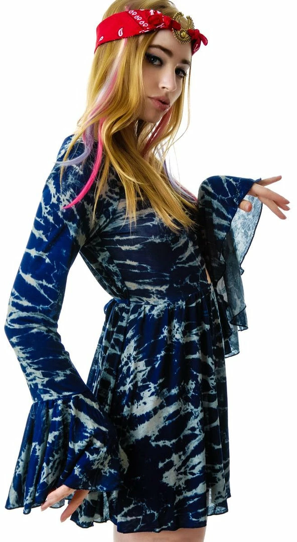 For Love & Lemons Arizona Dress as seen on the beautiful Chloe Norgaard is a super flirty and flowy dress to wear during all yer fanciful summer festivitiez! This super lightweight mini dress features a gorgeous allover navy blue and white tie-dye print, v-neckline and breast button adornment with a cute lil cutout right above yer belly button. Complimenting the beautiful top are long bell sleeves and full skirt with ties attached to flutter in the wind and move to the music while you light up and dance the night away!
