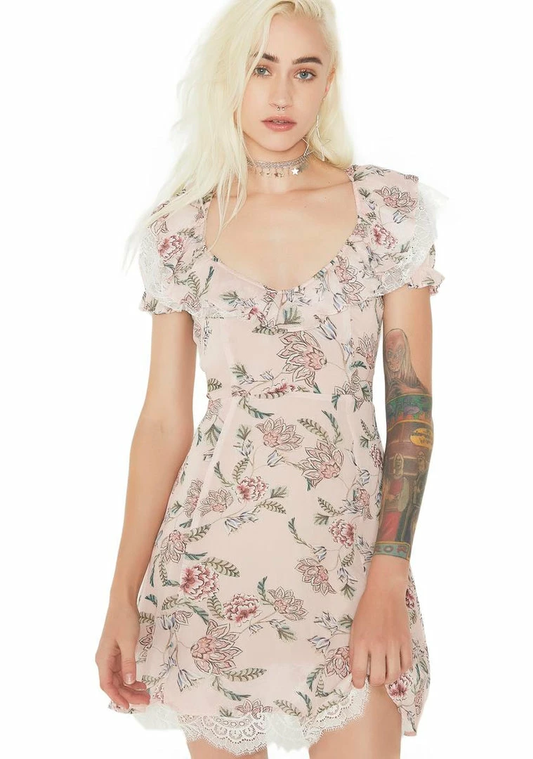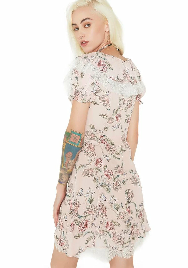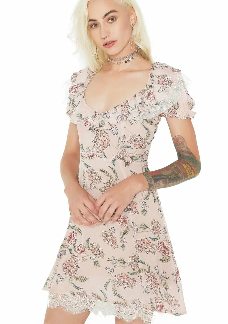 you make รขยยem flock like bees to a hive, babe…Flutter along with yer Queen Bee-ness in this romantic mini dress featuring a lightweight Nรขยย flowy construction, allover floral print, a scooped neckline with a wide ruffle collar and lace underlay, elastic ruffled cap sleeves, full lining, slight A-line hem with delicate lace underlay and invisible back zipper closure.