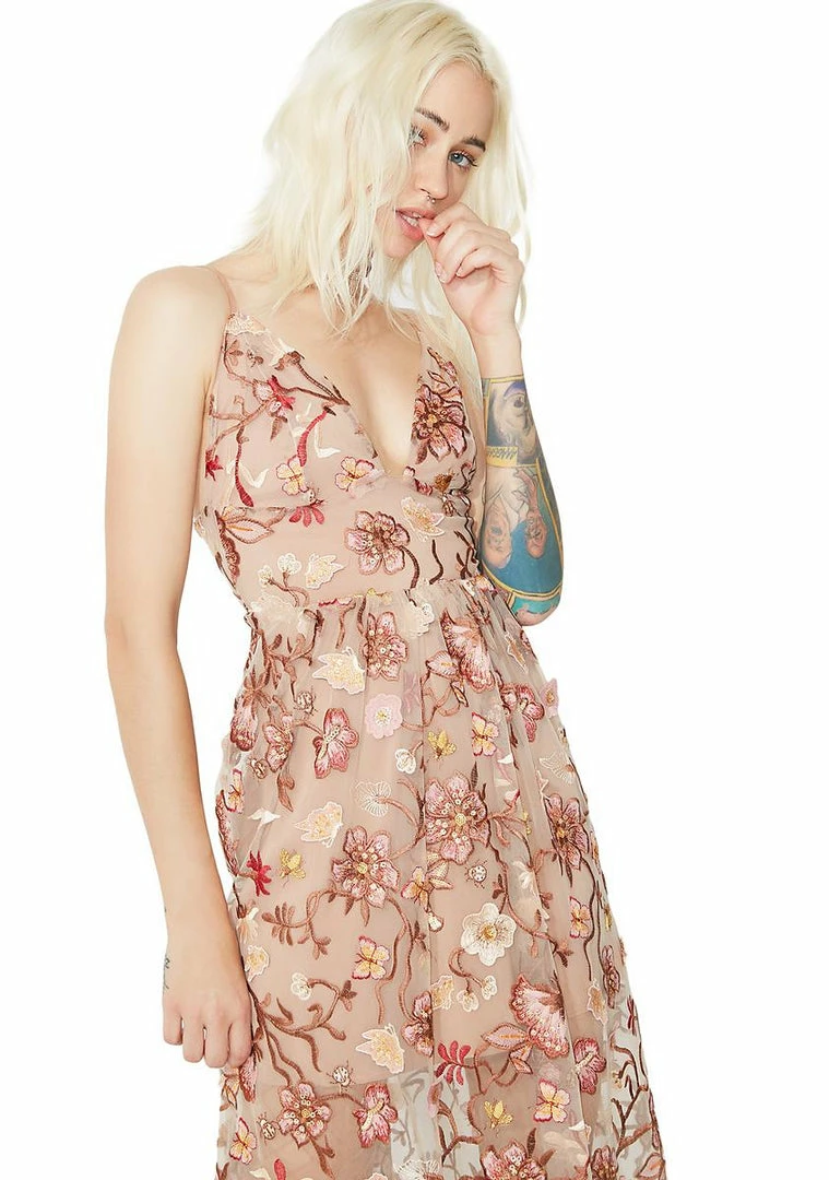 will make ya the most gorgeous garden fairy. This sheer midi dress has a gorgeous 3D floral embroidery, built-in short slip, and a back zipper closure.