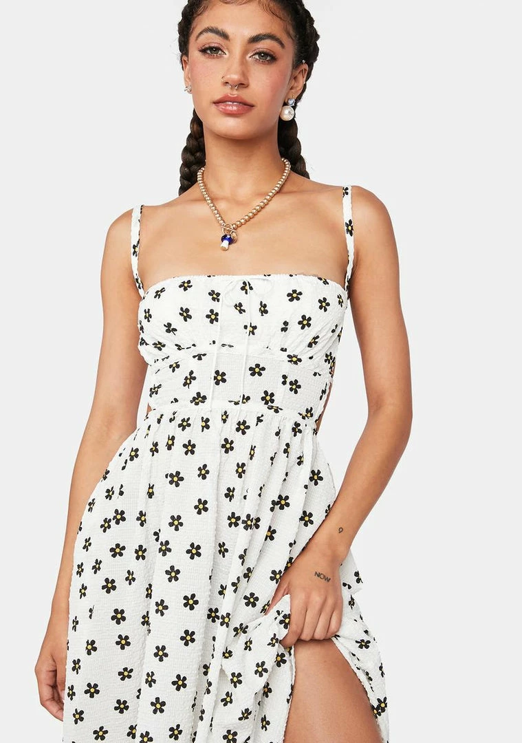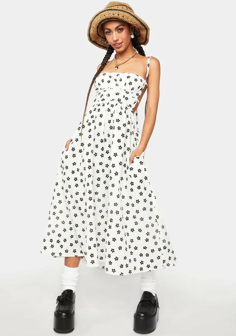 cuz you’re a real daisy. This midi dress has an all over daisy print, a square neckline, adjustable shoulder straps, pockets, shirred detailing, a decorative bow on the front, and an open back with adjustable tie closures.