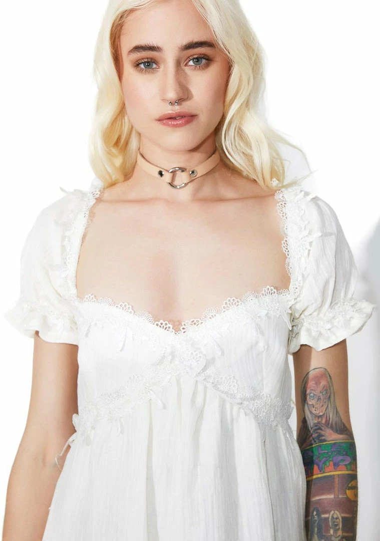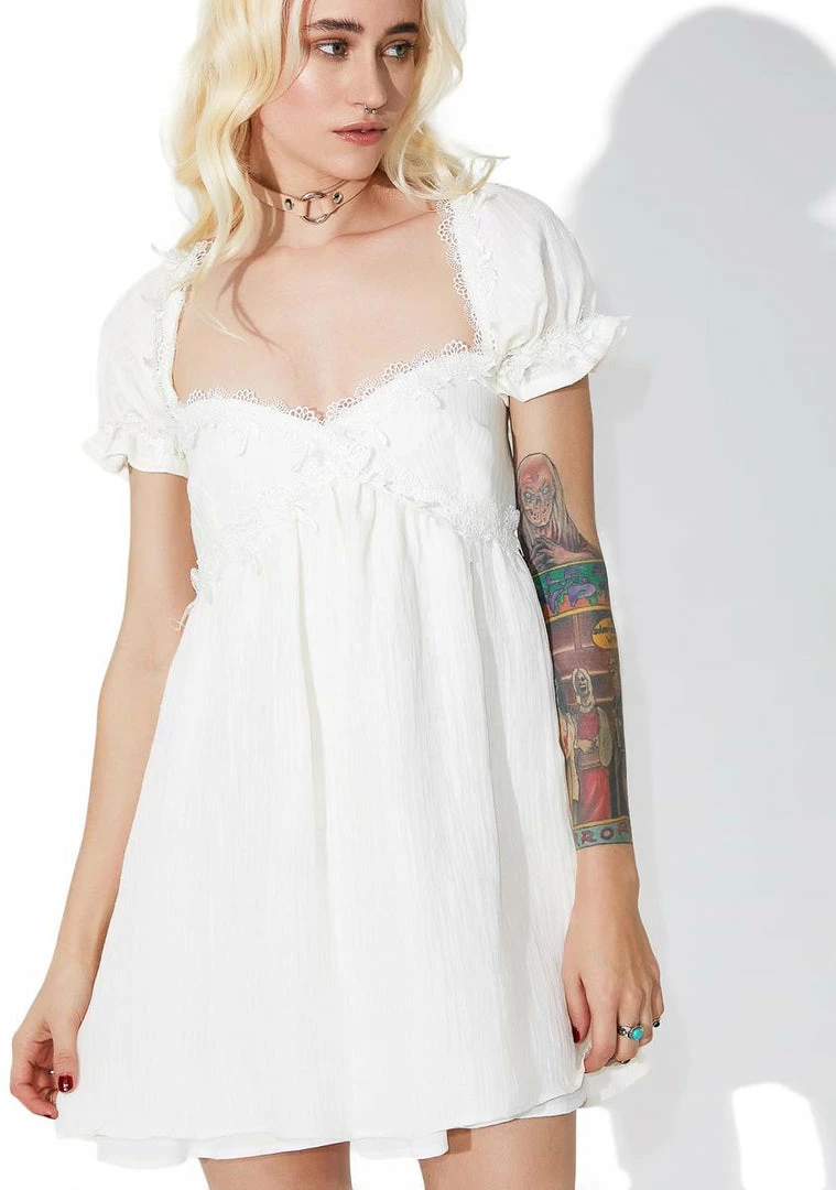 we just wanna tiptoe through the tulips with yew, babe! Float on with yer ethereal beauty in this dainty babydoll dress featuring a fully-lined light silk linen construction, elastic puff sleeves, empire waist, delicate floral lace trim and open back with ribbon tie closure.