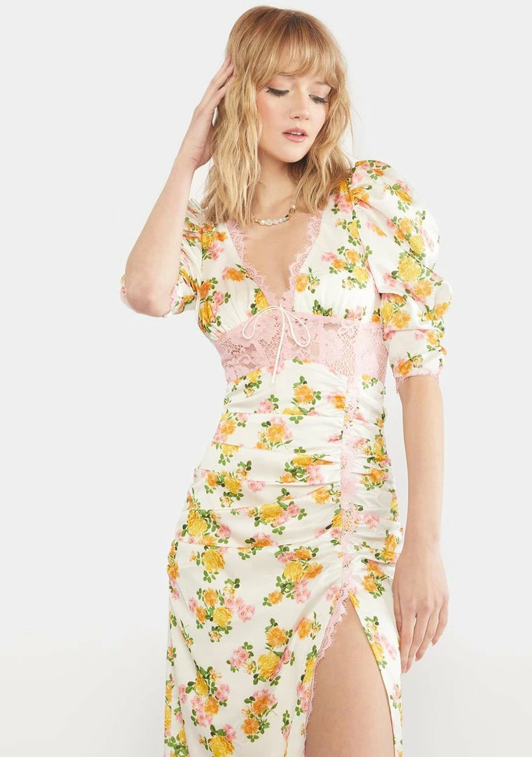 has a midi length fit, mig length puff sleeves, a ruched skirt with a slit up one side, lace trim at the plunge bust, torso, cuffs and hem, and a floral print all over.