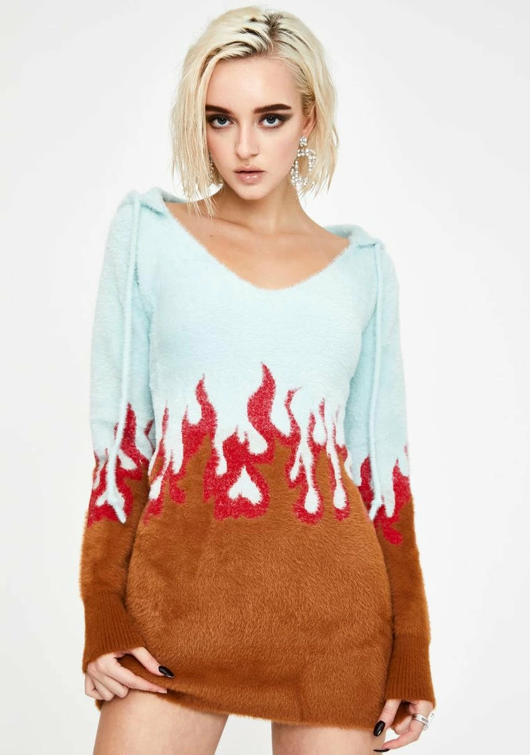 cuz u set spirits ablaze, bb! Light their fire looking cute in this flame printed mohair sweater dress with a short hem and open drawstring hood.