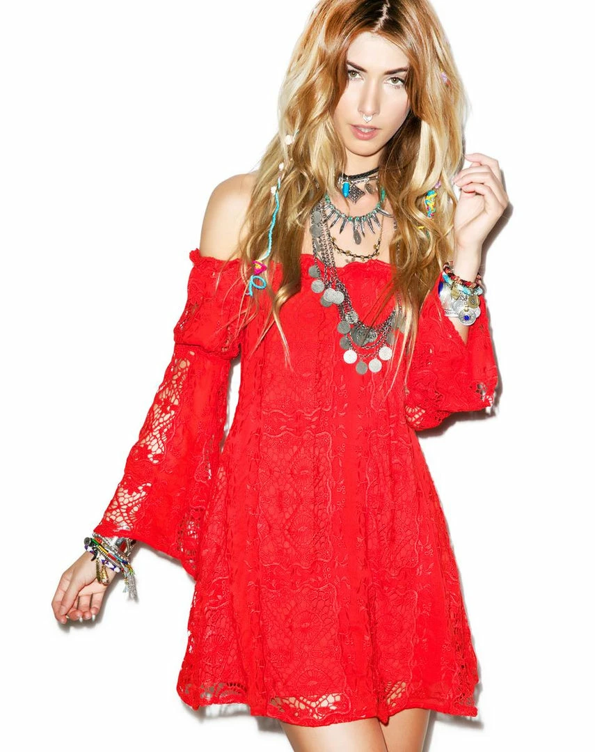 For Love & Lemons Garden Rose Dress, when ya wanna find a secret garden location on yer own. This beautifully delicate lace dress is perfect for exploring new destinations on gorgeous days. Featurinรย delicate textured floral lace and a loose roomy fit with an elastic off the shoulder cut for a whimsical feel. With sheer bell sleeves, dual side pockets and full interior lining, this beauty is gonna show off yer toned and tanned legs while still looking graceful. Yer gonna look like the prettiest flower in the garden when ya sway around in this stunning BB.