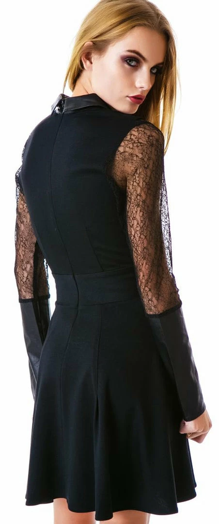 For Love & Lemons Innocent Dress features a beautiful black crochet knitted shell with a high neckline with faux leather collar and slim fitted body for all you dark Mercy babez! The knit on this badazz dress is totally see-through on top and comes with black paneling so you aren’t giving away the goodiez for free. Long knitted sleeves are finished with long faux leather cuffs, zipper back closure for ease of access, with a mid length pleated black skirt helps ya channel yer inner sex appeal.