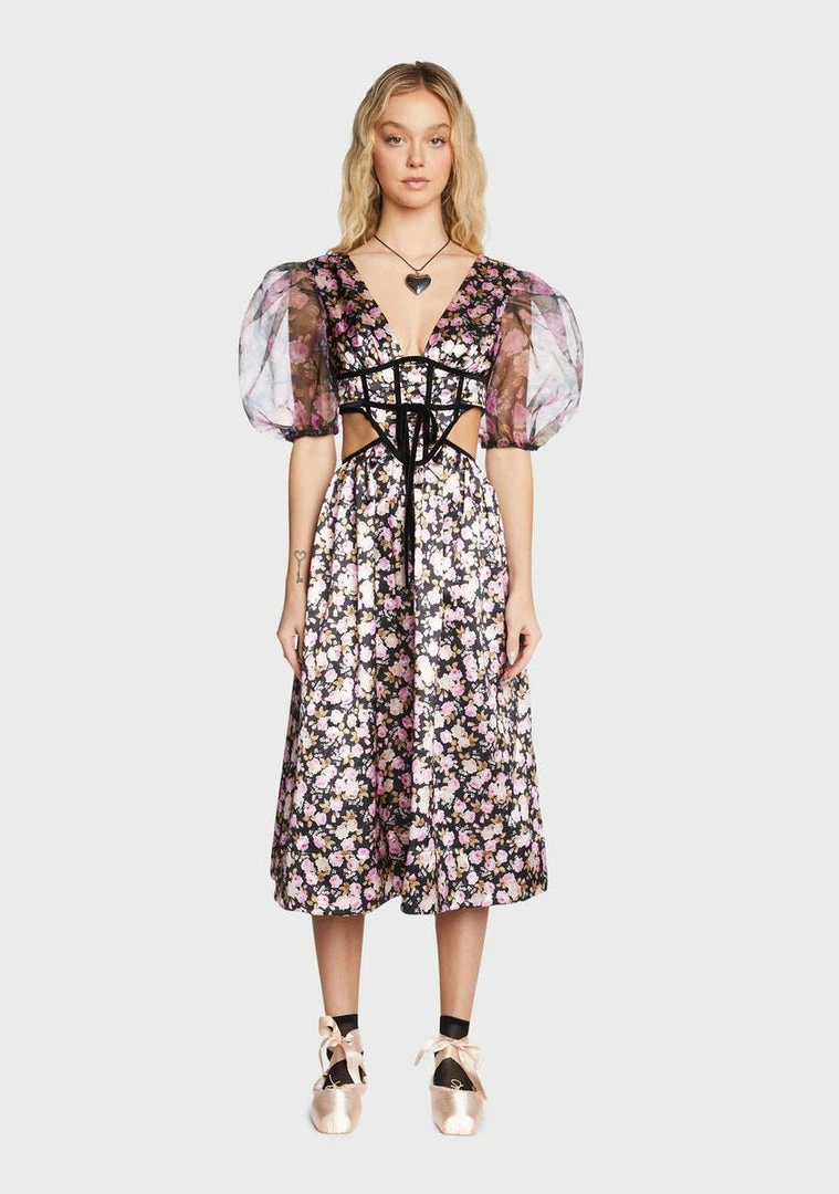 what’s your love language? This midi dress has a vintage-inspired floral print all over, a satin construction, short organza puff sleeves, contrasting trim, waist and back cutouts, back hook-and-eye closures, and a zip closure.