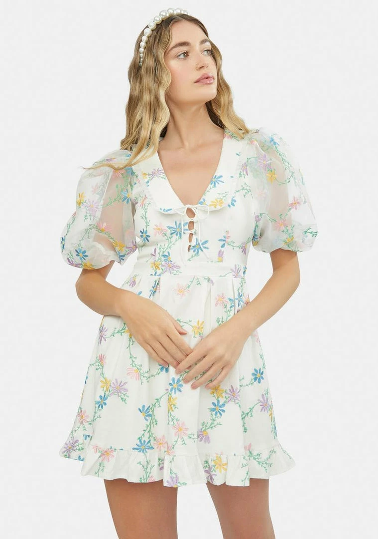 features a floral pattern all over, sheer puff sleeves, a lace up detail at the bust, plunge neckline, and ruffle trim at the hem.