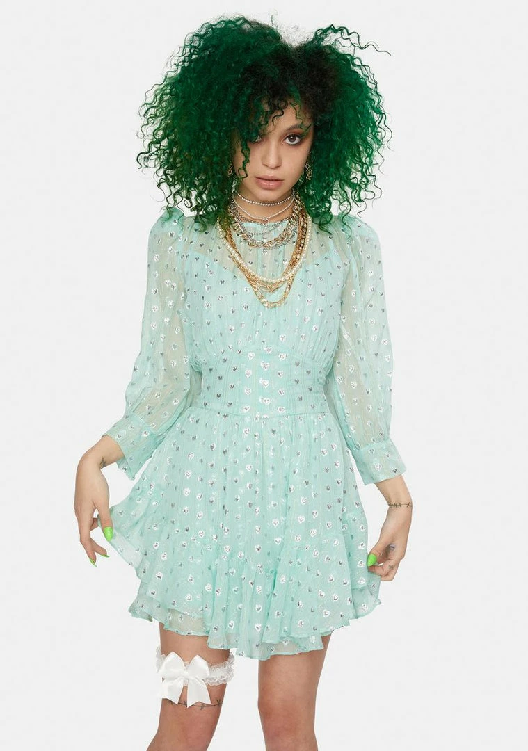love is in the air! This romantic mini dress has a silk chiffon construction with pintucked detailing, elbow length sleeves, a corset-style waist, a keyhole cut-out back, and an all over metallic heart print.