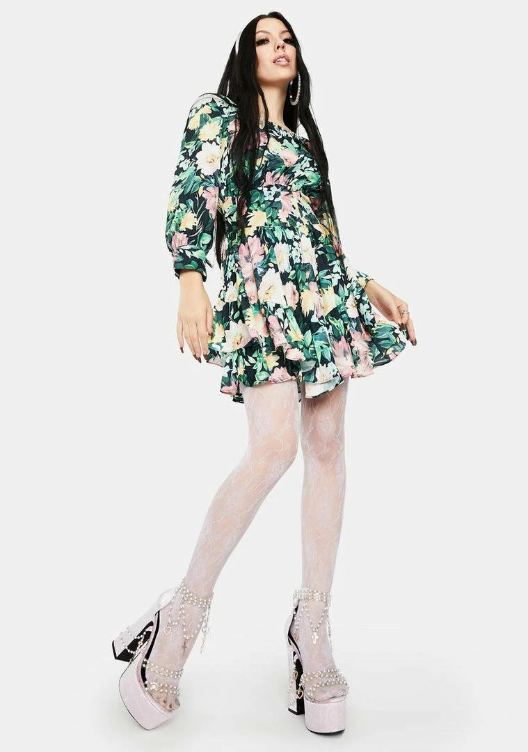features a tiered ruffle construction with a vintage-inspired watercolor floral print. This fitted mini dress has a peekaboo open back with button closures, removable shoulder pads, and a hidden back zip closure.