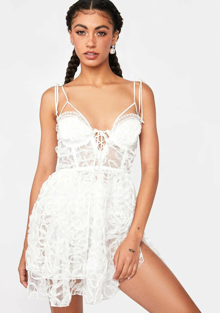 cuz you’re sexy and you know it. This mini dress has a sheer lace tulle construction, a 3D intricate swirl pattern, a structured bust, a front lace up design, adjustable shoulder ties, a layered skirt with a side slit, back hook and eye closures, and a matching satin panty.