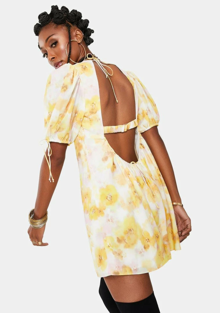 glow from within. This mini dress has a soft floral print all over, a sweetheart neckline with ruched bodice, puff sleeves, and open back.