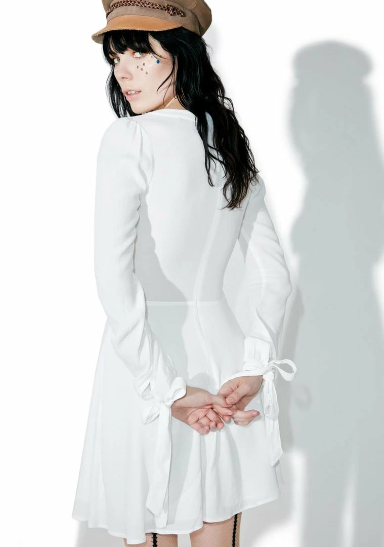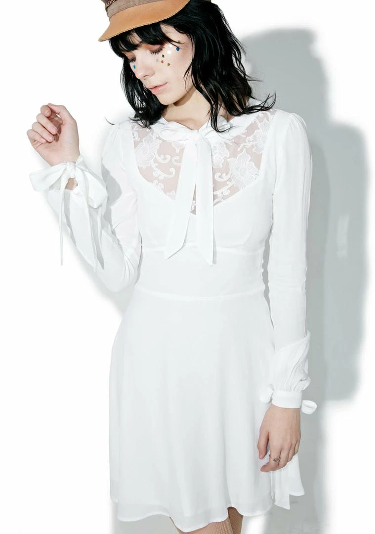 …take my hand and letΓ’ΒΒs run away together, bb. This gorgeous mini dress features a smooth white construction, structured bodice with sweetheart neckline, romantic tie cuffs, flirty flared skirt, white lace panel across the chest with bow tie, and zip closures.