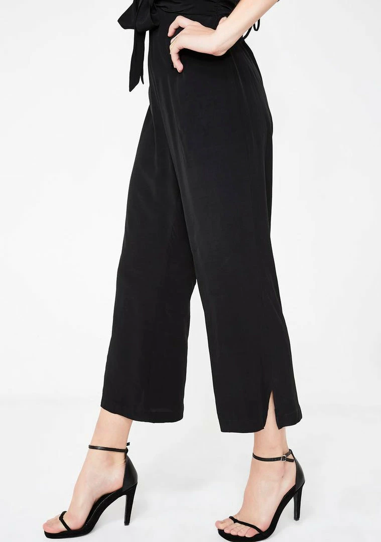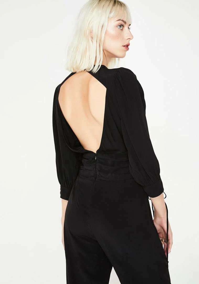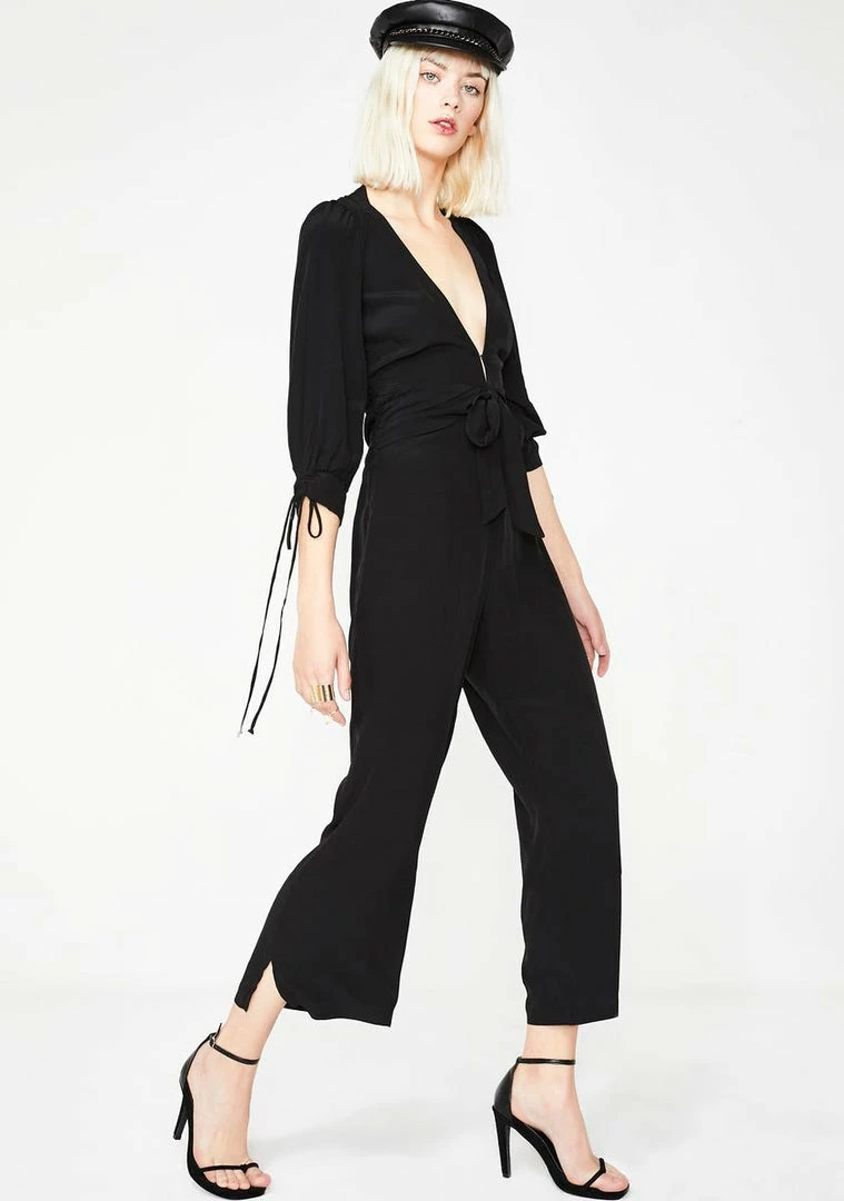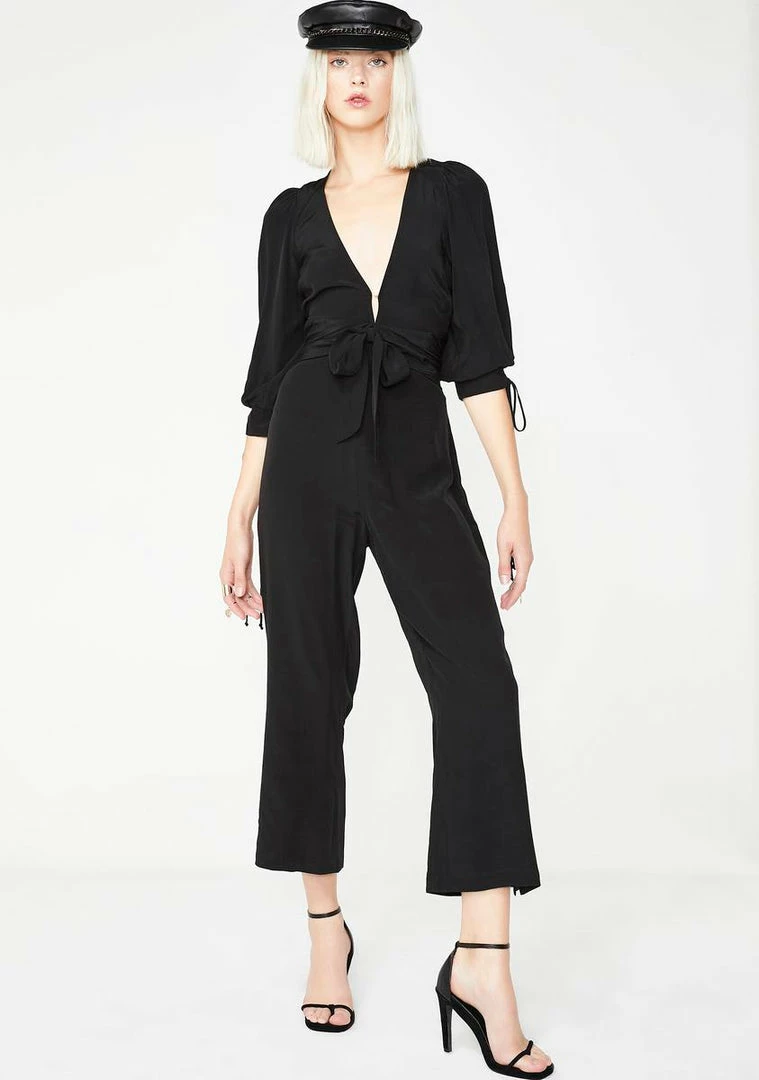 will keep you on their mind. Strut it out in this comfy NΓ’ΒΒ classy jumpsuit that has a flirty open back, ties at the cuffs, and a plunging neckline.