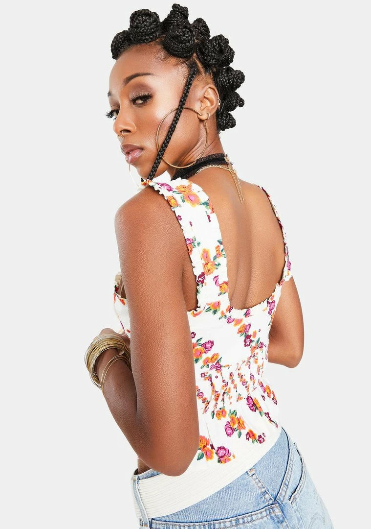 flower power for the win. This 70’s inspired crop top has a lace up front, ruffle trim, and an invisible side zip closure.