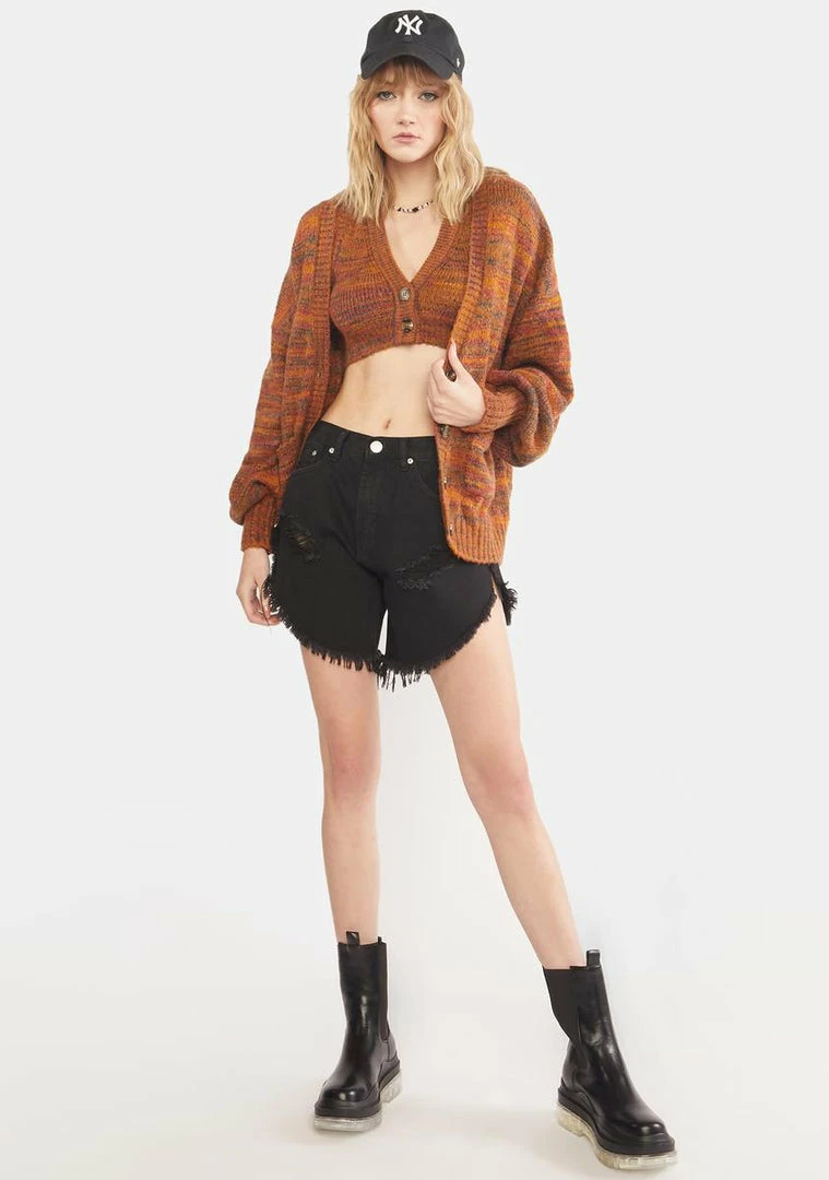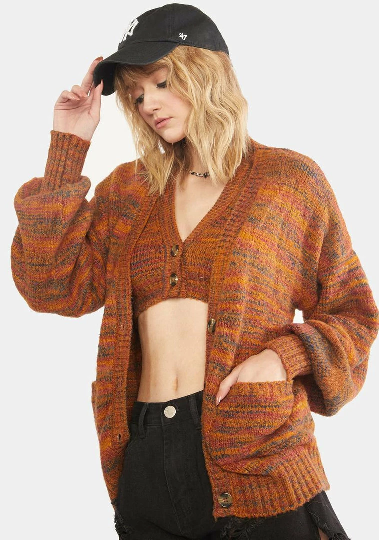 cuz youâll always be charming. This space dyed knit cardigan has long puffy sleeves, pockets on the front, and button up closures.