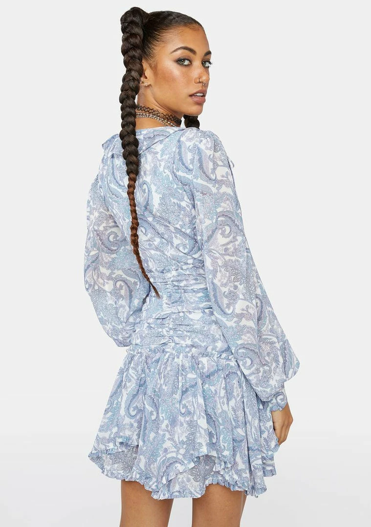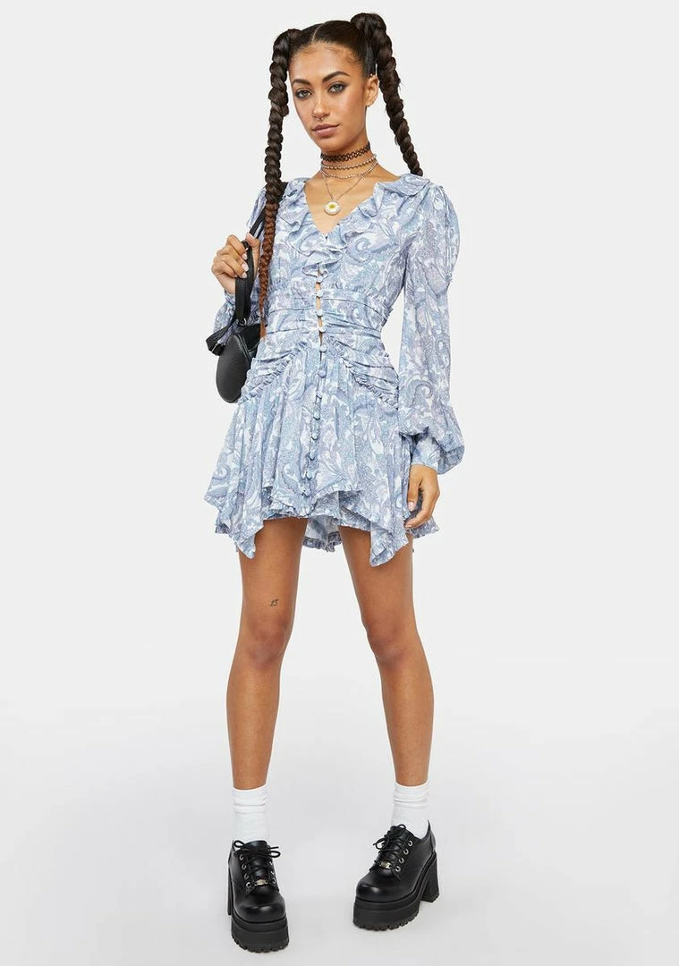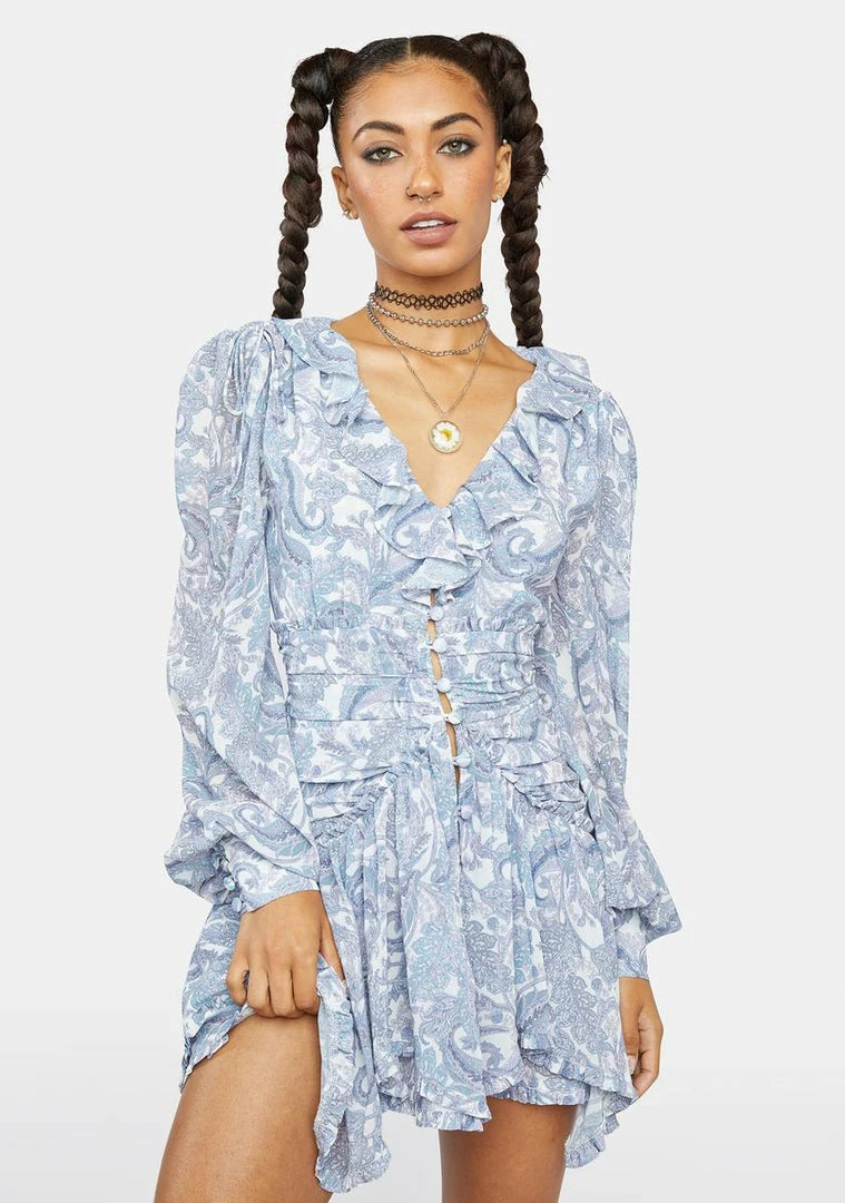 has a chiffon construction, a gathered waist panel with buttons up the front, a plunge neckline with ruffle trim, long puff sleeves with button cuffs, a handkerchief hem, and a paisley print all over.