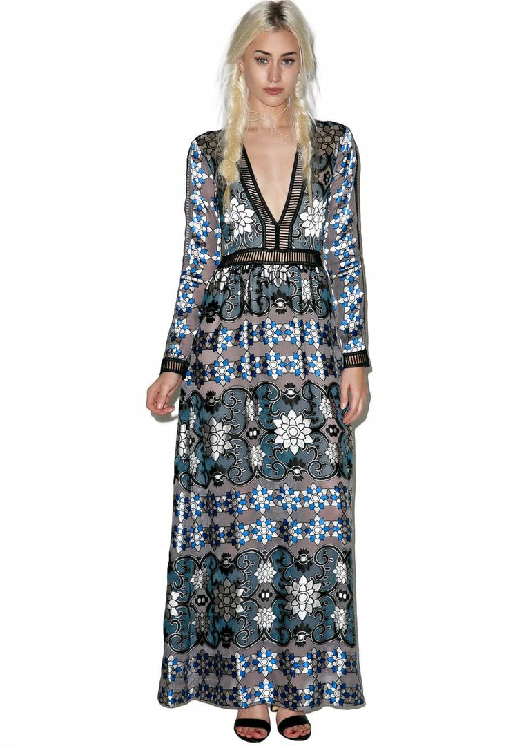will have ya feeling like yer living in a passionate whirlwind romance. Look like a star-crossed lover with this romantic flowing maxi dress that’s beautifully constructed from luxe silk with an all-over intricate interlocking satin burnout pattern of arabesque inspired floral scrolls that evoke old world whimsy. Featuring a nude built-in bodysuit for barely there coverage, signature open lattice trim providing sexy peeks of skin down the long sleeves and plunging neckline, dual pockets complete with concealed back zipper closure.