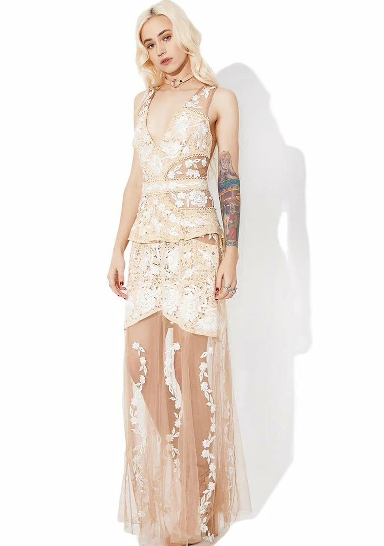 will have yew feelinΓ’ΒΒ romantic af, babe. Feel extra gorgeous in this beautiful dress that features a nude lace construction with white floral embroidering all over, deep v neckline, a nude mesh back with a keyhole opening and zipper closure, and a nude mesh maxi skirt with white floral embroidering climbinΓ’ΒΒ up yer legs.