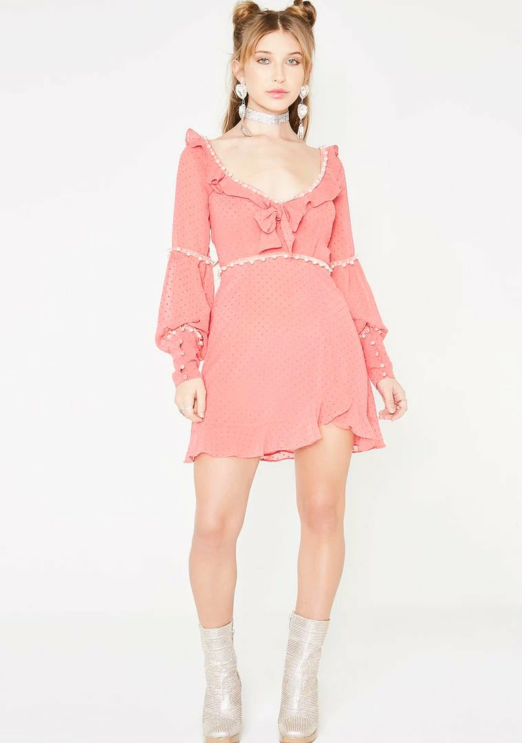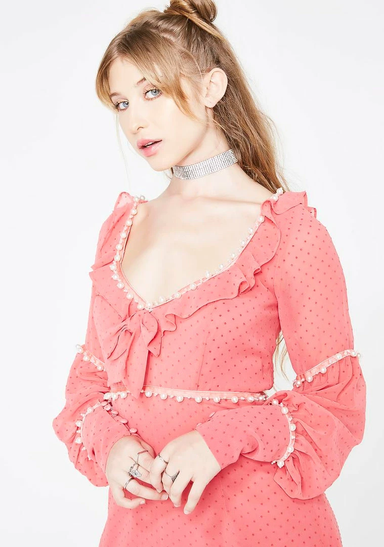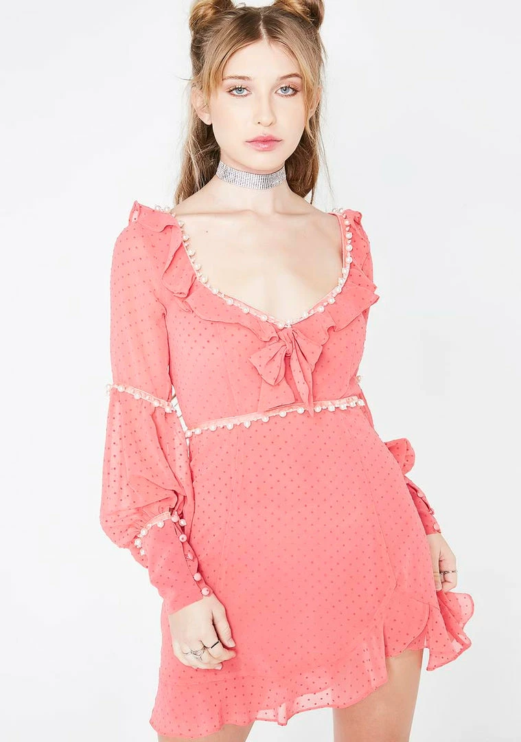 cuz youΓ’ΒΒre always the main attraction. Light up the room with all those babe vibes in this flirty NΓ’ΒΒ flowy polka dot dress thatΓ’ΒΒs embellished with lil pearls, has a ruffled V-neckline with a bow, button cuffs, and a back zip closure.