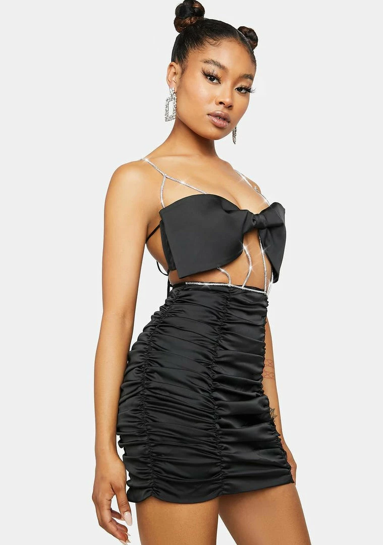 This mini dress has a stretchy satin construction, an oversized bow at the bust, crystal detailed straps, adjustable ties in the back, a ruched mini skirt, and a back zip closure.
