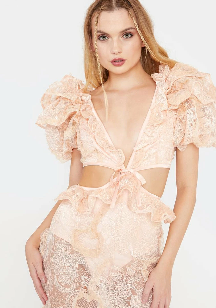 will have you looking magical. This embroidered lace maxi dress has tonal satin trim, statement ruffles, large puff sleeve details, a plunging neckline with a tie front, cut-outs on the waist, a triple tiered design on the bottom, adjustable tie back straps, and a hidden side zip closure.