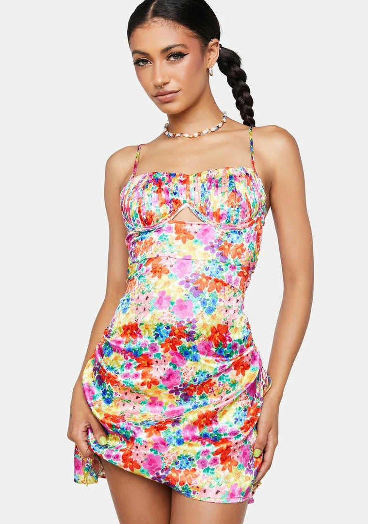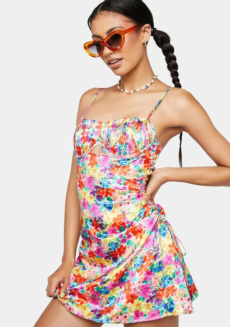 cuz summer is yours. This mini dress comes in a satin construction, with a pleated wired bust, cut out detail, adjustable spaghetti straps, adjustable side tie closures, and a floral print all over.