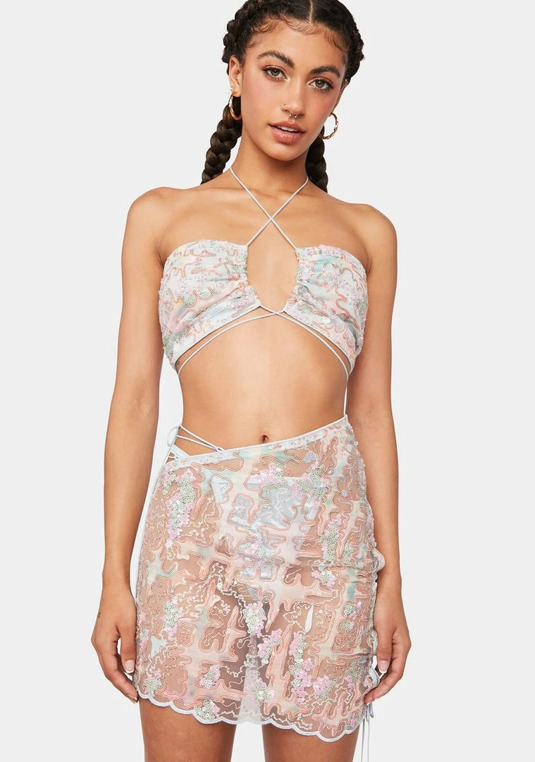 cuz you want it, you got it. This mini skirt has a sheer sequin construction, a cut out lace up design with adjustable tie closures, a low waist fit, and a scallop trim.