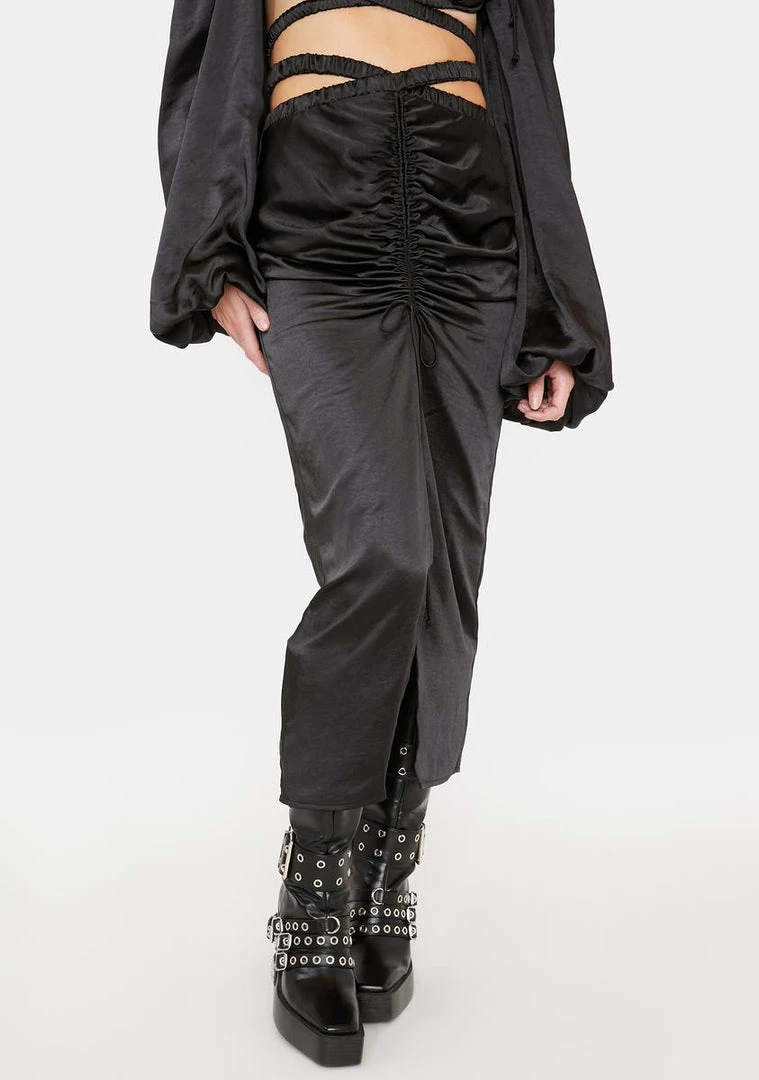 has a slinky satin construction with ruched detailing, a high slit on the front, scrunched crossover wrap straps on the waist, and a back zip closure.
