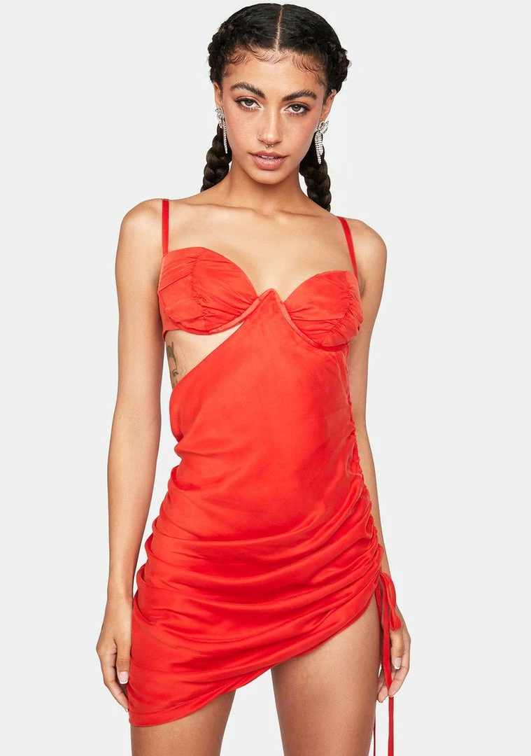 has a structured bust design with cut out detailing, a sweetheart neckline, adjustable shoulder straps, a ruched design on the side with adjustable ties, and a bodycon fit.