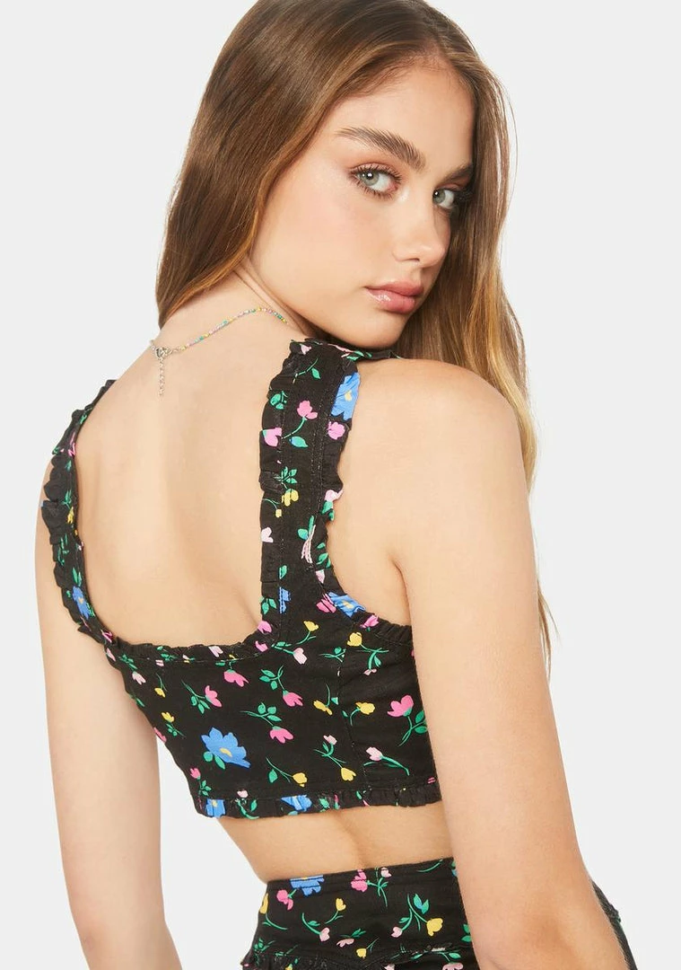 comes with frill trim details, a button front closure, scoop neckline, and flower print all over.