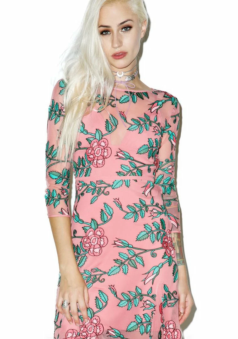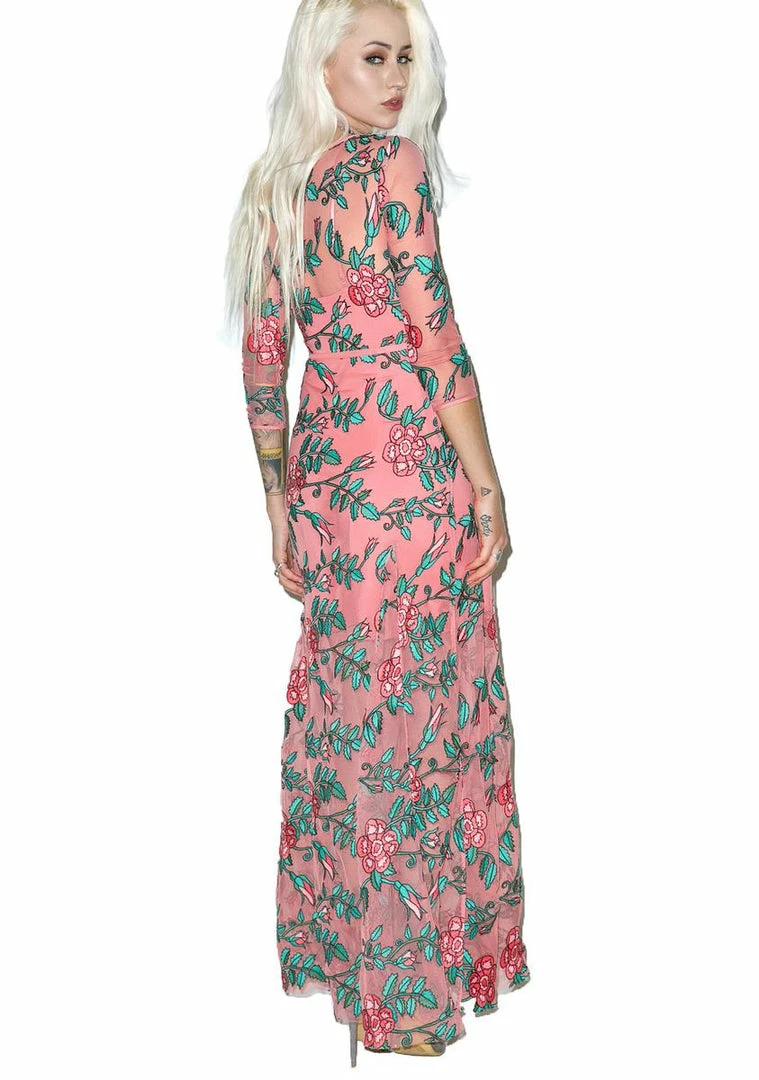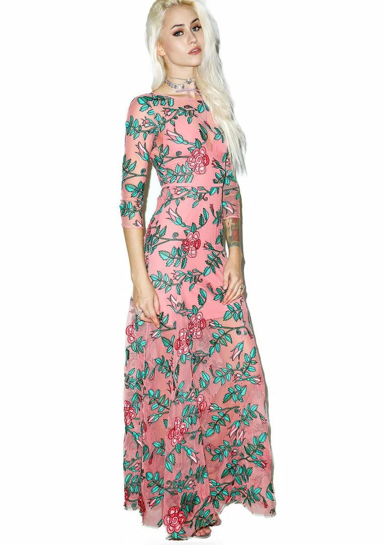 …we just wanna be close to you, babe. TheyΓ’ΒΒd endure all tha thorns Γ’ΒΒN scrapes to see you in this gorgeous three-quarter length sleeve maxi dress, featuring a fully embroidered all over rose and vine print, sheer dusty rose mesh construction, slim, curve hugginΓ’ΒΒ fit that flares slightly at the hem, rounded neckline, a smooth triangle mini slip to give ya light coverage, and a side zip closure.