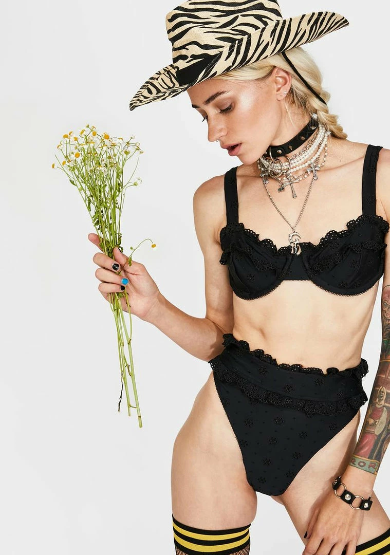because youΓ’ΒΒre looking hotter than the weather, babe. Show off in this sexy bikini top that has underwire support, frilly eyelet lace trim and a back tie closure.