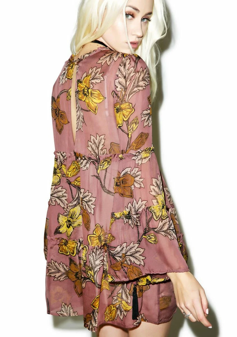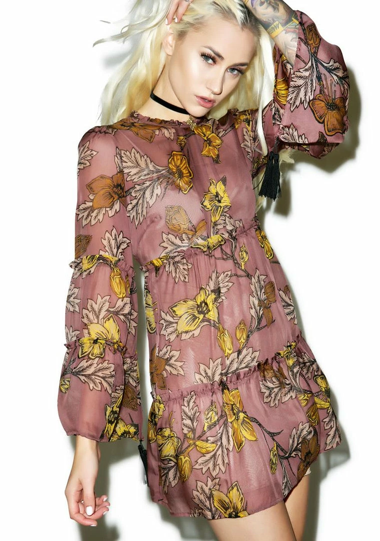 looks effortlessly romantic. This gorgeous mini shift dress is constructed from soft delicate material that perfectly flows over yer figure with a garden floral print and ruched tiered pleats. Featuring long bell sleeves with tassel accents, optional slip and back keyhole button closure.