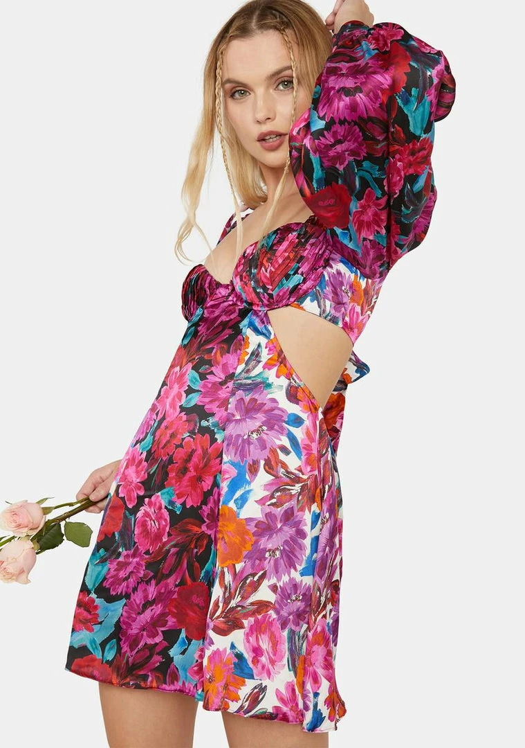 cuz youΓ’ΒΒre the most divine dream. This floral print mini dress has long puff sleeves, pintuck underwire cups, a sweetheart neckline, cut-outs on the sides, and tie strap details on the shoulders and back.