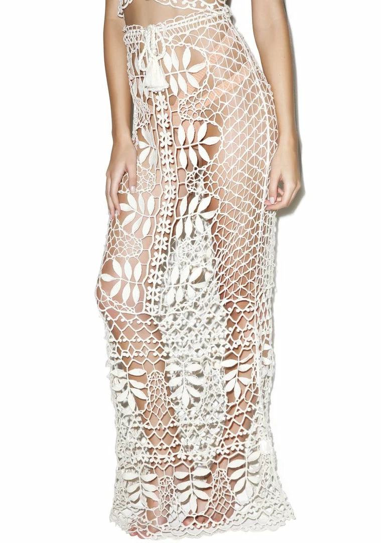 cuz sun kisses are better than yers. Feel the island rays in this stunning maxi skirt featuring a loose hand drawn crochet pattern with leafy details and drawstring waist tie.