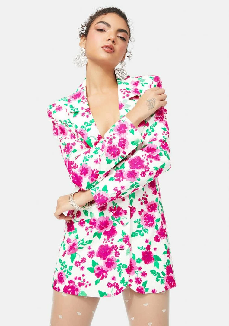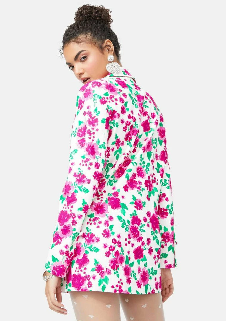 cuz you always make a statement. This boho boss boyfriend blazer has a stretch linen construction with a floral pattern, notched collar, and shoulder pads for a boxy oversized fit.