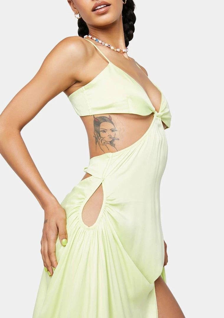 cuz you’re simply fabulous. This maxi dress comes in a satin construction, with a triangle style top, cut out details, ruching details, a split hem, adjustable spaghetti straps, hook and eye closures, a tie closure, and zip closure.