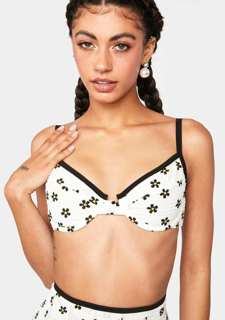 cuz you’re a real daisy. This bra top has an all over daisy print, an underwire bust, a black satin trim, adjustable shoulder straps, and back hook and eye closures.
