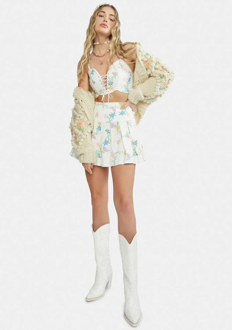 features a structured corset design, an open front with a lace up detail, and a floral pattern all over.